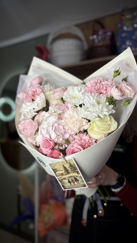 Роза кустовая 60см, Хризантема кустовая, Гвоздика цветная, Гортензия, Роза Эквадор 70см, Тишью, Фоамиран, Лента, Открытка