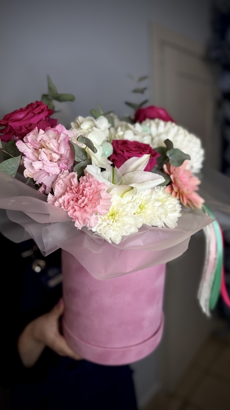 Роза Эквадор 70см, Краспедия, Гортензия, Гербера Рич, Хризантема Одноголовая, Хризантема кустовая, Эвкалипт, Гипсофила, Коробка, Биофлора, Пленка, Лента.